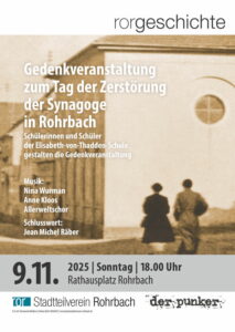 In der Nacht vom 9. auf den 10. November 1938 wurde auch in Rohrbach die Synagoge in Brand gesetzt und zerstört. Rohrbacher Jüdinnen und Juden wurden in Angst und Schrecken versetzt und das einzige damals noch bestehende Geschäft einer jüdischen Rohrbacher Familie verwüstet. Die Übergriffe auf jüdische Bürgerinnen und Bürger, ihre Geschäfte und Einrichtungen waren Teil der reichsweit organisierten Pogrome, die von der NS-Führung geplant und propagandistisch begleitet wurden.