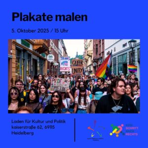 Willkommen bei unserer Terminliste. Hier findet ihr sowohl Veranstaltungen unseres Bündnisses Kein Schritt nach Rechts Heidelberg als auch externe Veranstaltungen aus dem Heidelberger Raum, die sich gegen Rechts und/oder für eine bunte vielfältige Gesellschaft einsetzen. Wenn ihr weitere Termine habt, die eurer Meinung nach fehlen, dann schickt uns gerne eine Mail.